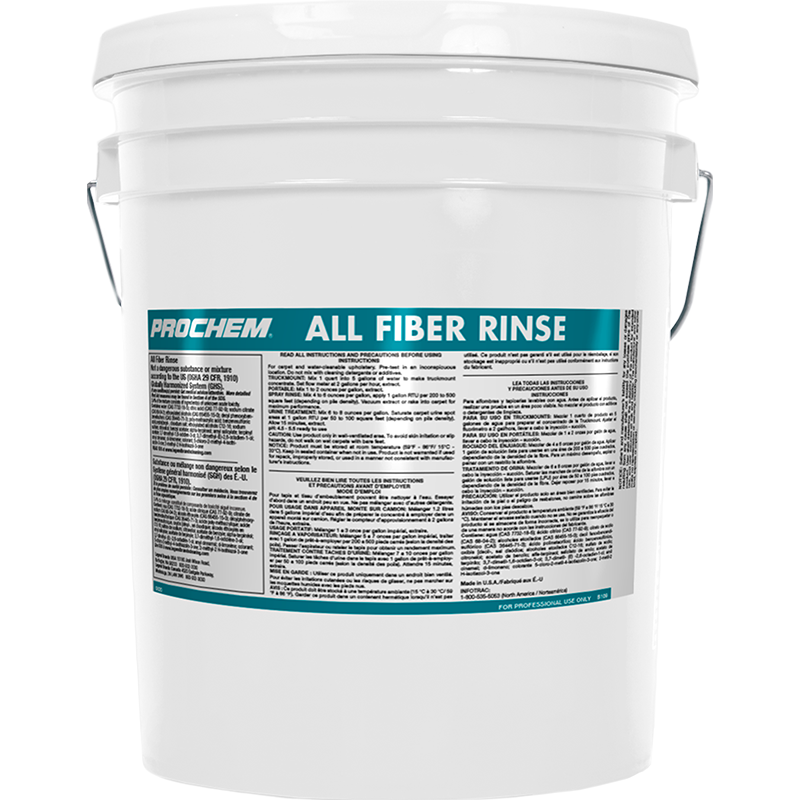 Prochem All Fiber Rinse (liquid) is our premier multi-purpose acidic extraction rinse. Features premium-grade ingredients that emulsify and remove soils and prespray residues that others leave behind, while safe organic acids neutralize alkalinity and leave fibers bright and luxuriously soft to the touch while inhibiting bleeding, dye migration, browning and soil wicking. Use it to stabilize dyes on most fabrics, area rugs and other textiles. Also effective as a urine neutralizer: apply as a post-mist or use as part of a deep saturation and sub-extraction decontamination process.