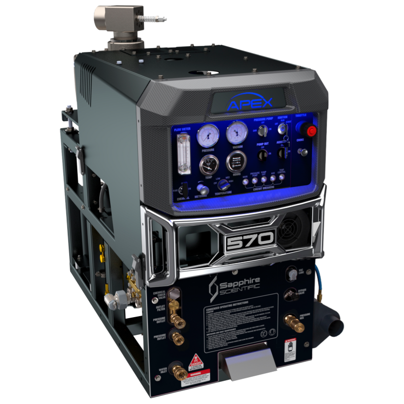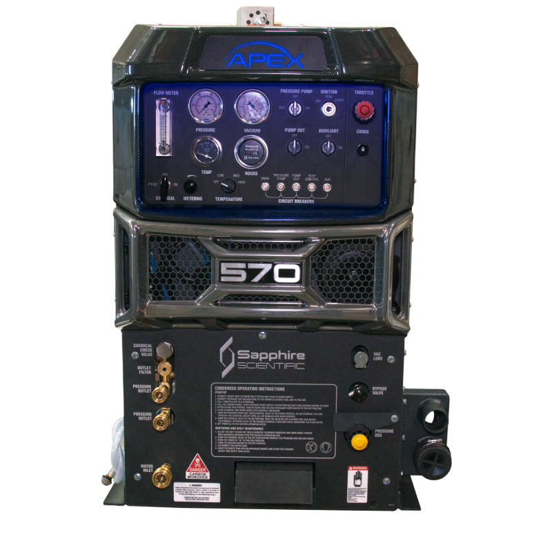 Powered by a liquid-cooled cast iron Kubota engine, the Apex 570 truckmount uses the patented Sapphire Scientific triple-source thermal well system to deliver consistent high heat. Cerakote ceramic coating lowers the heat radiation on all exhaust components by more than 30%—extends truckmount life and helps to keep van interiors cooler. (Not available in California.)