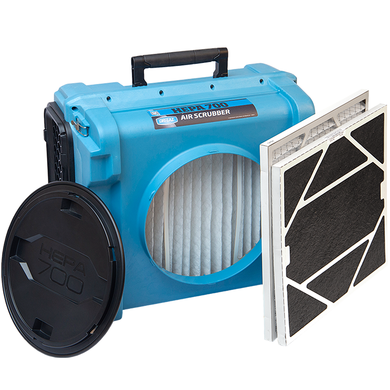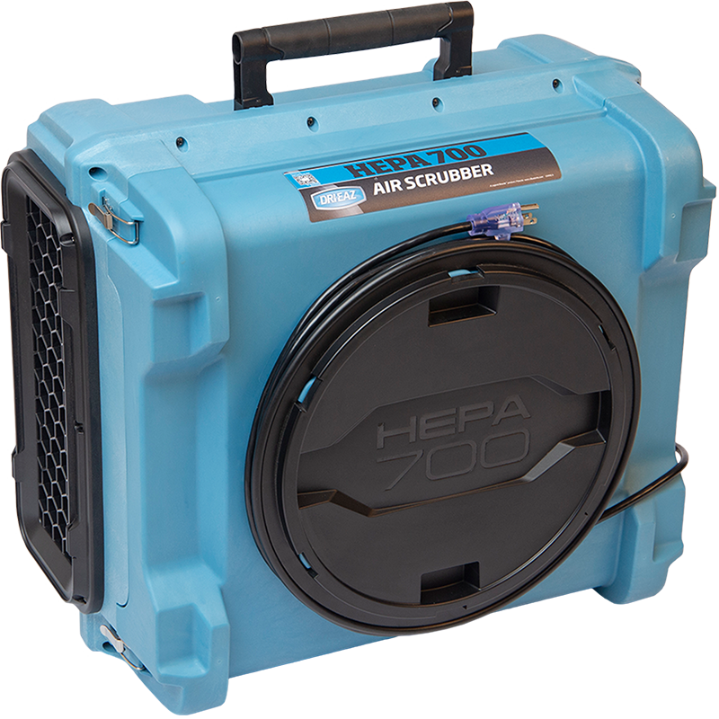 This streamlined HEPA 700 air scrubber delivers quiet AND powerful 275-700 CFM air filtration for water and fire damage restoration, mold remediation, construction and air purifying for residential, industrial, education, commercial and institutional settings. Advanced HEPA filtration removes dust, mold, viruses and other particulates - and meets DOP standards using the primary HEPA filter and 2-in. prefilter that are included with the HEPA 700.
