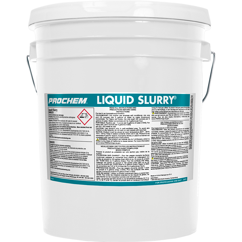 Liquid Slurry is an extremely potent solution that uses the strength of alkaline builders and powerful surfactants to quickly emulsify suspended greasy soils, grime and prespray residues, leaving fibers bright, soft and clean. Safe for use on fifth generation nylon carpets. Now formulated with new-technology polymers that surround remaining microscopic soils that can lead to wicking and browning, Liquid Slurry captures soils during the drying process for easy removal and a superior long-lasting clean.
